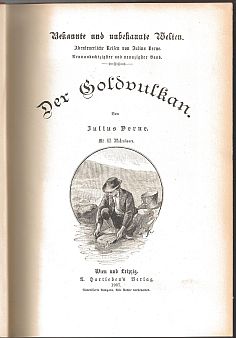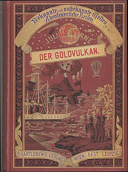 Julius Verne 88. Band" . 33 illustrationer (orig. franske) ![]() "Der Goldvulkan" del 1-2. A. Hartleben´s Verlag Wien und Leipzig. 1907. Serien "Bekannte und Unbekannte Welten" bind 89-90. 469 s. Brun komponeret shirting med tryk i sort, rødt og guld. . ![]() Eksempler på de alternative indbindinger, som blev benyttet