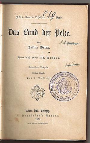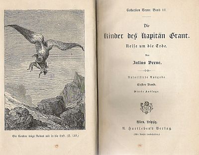 ![]() "Die Jangada" 1. og 2. bind inkl. "Von Rotterdam nach Kopenhagen am Bord der Dampfyacht "Saint Michel"" af Paul Verne. 1882. Det er det lille format i rød helshirting med forsidebillederne (2 ens) indklæbet. ![]() "Das Land der Pelze" 1. bind. Det er bind XVII i serien "Julius Vernes Schriften" 3. oplag 1879. 284 s. Bogen har tidligere været på et bibliotek i Würzburg. ![]() ![]() ![]() En lille heftet Hartleben-udgave: "Der grüne Strahl".