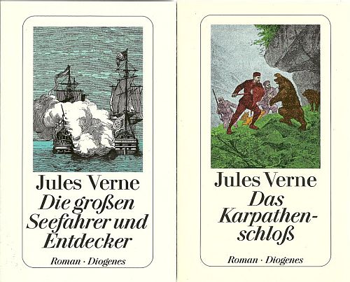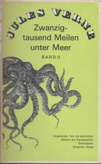 "Von der Erde zum Mond", Diogenes Verlag AG, Zürich. 1966. 41 illustrationer og 2 kort - de originale franske.Oversat af William Matheson. 302 s. + 1 s. indholdsfortegnelse. Tryk: Suddeutsche Verlagsanstalt und Druckerei, Ludwigsburg. Grågul helshirting med smudsomslag. "Zwanzig-tausend Meilen unter Meer" I-II. Diogenes Verlag AG, Zürich. 1966. 51 illustrationer og 1 kort + 60 illustrationer og 1 kort -