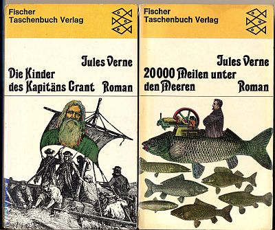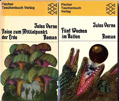 Helshirtingsindbinding med illustreret smudsomslag. ![]() Fischer Taschenbuch Verlag. En næsten komplet samling (18 af ialt 20) af tyske paperbacks udsendt af Fischer Taschenbuch Verlag i adskillige oplag i 60'erne til 80'erne og i 100.000-vis af eksemplarer. De indeholder en del af de originale illustrationer; Frelserkirkens tårn er således medtaget. De er endvidere forsynet med nogle pudsige surrealistiske omslagstegninger af Heinz Edelmann. ![]() ![]() ![]() ![]() ![]() Von der Erde zum Mond" i den første serie med nummeret