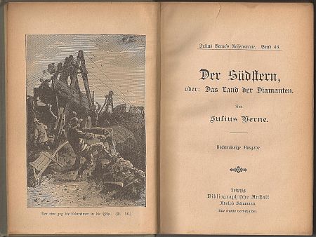 "Mistress Branican 1-2" u. år. Serien: "Julius Verne´s Reiseromane Band 60-61", 1 iil. i hvert bind. "Der Südstern, oder: Das Land der Diamanten". .Disse er udaterede, men iflg. Andreas Fehrmann er de udsendt 1903-06. . ![]() . Serien "Julius Verne´s Reiseromane" Band 46. Bibliographische Anstalt Adolph Schumann, Leipzig. Men