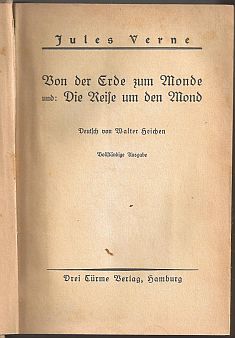 inform you. ![]() Hermann Hiller Verlag Von der Erde zum Mond" i serien "Kürschners Bücherschatz" med nummeret 306. Den er udgivet af Herrmenn Hiller Verlag, Berlin, Eisenach, Leipzig udedatering. Af forordet om Jules Ve fremgår, at han er nær 75 år gammel, så bogen er fra 1902/03. Den er heftet og har nærmest billigbogsudseende og kostede "kun" 20 pfennig. Der er dog illustrationer i jugendstil af tysk kunstner: "W. Roegge". Den er på 124 s. Af reklame i bogen for serien fremgår, at nr. 210-11 i serien er "Reise um