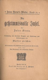”Die geheimnisvolle Insel II”, A. Weichert Verlag, Berlin u. år (1901-09) . Serien ”Jules Vernes Werke Band 29”. 1 illustration. 188 s. + 1 s. indholdsfort. Forlagets heftede udgave. .