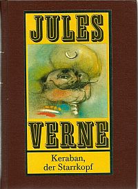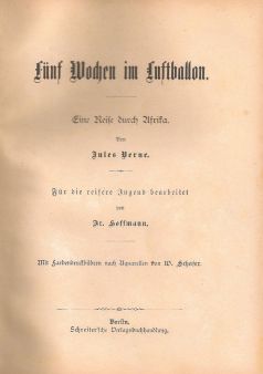 ![]() Tre tyske (DDR) fra årene 1978-79, indbundne og illustrerede i moderne stil. Der er påklæbede billeder på bindenes forsider. "Ein Kapitän von 15 Jahren", endnu en Servadac: "Hektor Servadacs Weltraumreise" og endelig "Keraban der Starrkopf". Alle fra Verlag Neues Leben Berlin. De tre tyske Verne-bøger er en præmie for besvarelsen af en konkurrence i det seneste nummer af "Nautilus", det tyske Verneselskabs halvårlige tidsskrift, som hermed anbefales varmt. Et samlebind med 3 romaner, hvoraf 1 af Jules Verne, og da jeg ikke har kunnet finde nogen oplysninger om denne udgave på den tyske Jules Verne Clubs hjemmeside. Indeholdende: ”Fünf Wochen im Luftballon. – Eine Reise durch Afrika”. Schreiter´sche Verlagsbuchhandlung, Berlin. U. år (ca. 1895-10?) Bearbejdet for ungdommen af Fr. Hoffmann. 5 indklæbede farvelithografier af W. Schafer. 228 s. Tryk: Maschning & Kantorowicz, Berlin C. Bind: Brun komponeret helshirting med tryk i sort og guld. Stilen er typisk ”Jugend” med blomsterornamenter..