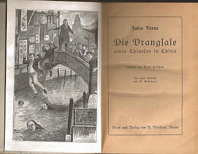 ![]() "Drangsale eines Chinesen in China" . Serien Kollektion Jules Verne nr. 9. 1 illustration af R. Grünberg. Druck und Verlag von A. Weichert, Berlin. U. år (ca. 1925). Karton med shirtingsryg. Påklæbet etiket med forf. og titel på