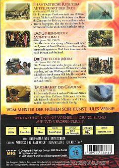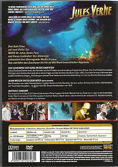 | Foruden enkelte film findes der en del filmboxe og andre samlinger af Vernefilm. følgende er af tysk oprindelse. Filmbox 1. Indeholder fire film: Phantastische Reise zum Mittelpunkt der Erde , GB/Spanien 1977 (Rejsen til jordens indre). Das geheimnis der Monsterinsel, USA/Spanien 1981 (Robinsonskolen) Die Teufel der Meere, USA/Spanien 1981 (Kaptajnen på 15 år) Tauchfart des Grauens , USA/GB 1977 (om søgning efter Atlantis, ikke genkendelig JV). ![]() Filmbox 2 (2010): Indeholder 3 film: Die Stadt aus Stahl, CSSR 1978 (Begums millioner) Die Reise ins Zentrum der Zeit (om en tidsmaskinerejse, ikke Jules Verne) Die Reise zum Planet des grauens, USA 1982 (Den hemmelighedsfulde ø, hvor øen er erstattet med en fjern planet) ![]() Filmbox 3 (2010). Indeholder 3 film: Mathias Sandorf , Fr/It/Sp, 1962 20.000 Meilen unter dem Meer , USA, 1916 (også dele af Den hemmelighedsfulde ø). Das Geheimnis der Burg in den Karpaten, CSSR 1981 ![]() Filmbox 5 (2012). Indeholder 3 film: 20.000 Meilen unter dem Meer, TV serie, USA 1997. Von der Erde zum Mond, USA 1958 Rakete zum Mond, USA 1950 (fantasier inden Sputnik, ikke JV) ![]() 3 film fra "Les inédits fantastiques": Les indes noires, 1964, Le secret de Wilhelm Storitz, 1967 og Maitre Zacharius, 1973. ![]() |