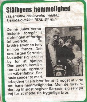Et udateret udklip fra et ugeblad (måske ”SE og Hør”?) – Af dette fremgår, at filmen ”Stålbyens hemmelighed” (=”Tajemstwi ozeloweho mesta”) Tjekkoslovakiet 1978 er vist i dansk TV. Det er en filmatisering af ”Les cinq cents millions de la begum”. .