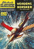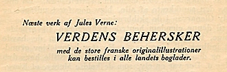 VE 53: Verdens behersker (Maître du monde) 1904. Besynderlige hændelser rapporteres fra området ved Great Eyrie i den vestlige del af staten North Carolina, USA. Den amerikanske regering sender sin bedste opdager, John Strock, ud for at afsløre mysterierne bag fænomenerne, men det mislykkes for ham. Senere indløber der rapporter fra overalt i landet om objekter, der synes at færdes snart i luften, snart til vands og snart på landjorden. Er det muligt at alle disse forekomster har noget at gøre med hinanden ? Da det bliver fastslået, planlægger John Strock at fange dette fartøj, som dets ejer kalder the Terror. Nordiske udgaver: Norge: Verdens behersker: Cammermeyer (1918). (aldrig set, men nævnt i følgende reklame: ![]()