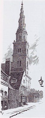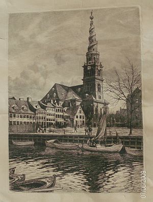 Endnu et kirketårn, denne gang set fra kanalen. Billedet, en radering,