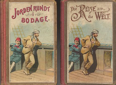 ”Die Reise um die Welt”/”Die Reise um die Erde in 80 Tagen”. ”Nach Julius Verne bearbeitet von W. Christian. Mit vielen Farbendruckbildern”. U. år. 72 s. Illustration på forperm + 4 indklæbede illustrationer. Bogblokkens format: 17,8x12,2 cm. På sidste side nederst: ”Druck und Verlag von G. Löwensohn, Fürth (Baiern).” Bind: Karton med rød shirtingsryg. N. Hansen & Co. ”Jorden rundt i 80 Dage”. ”Efter Julius Verne bearbejdet for Ungdommen af W. Christian. Med mange Farvetryksbilleder. Kjøbenhavn. N. Hansen & Co.s Forlag.” U. år. 76 s. Illustration på forperm + 3 indklæbede illustrationer. Bogblokkens format: 17,9x11,4 cm. Bind: Karton med rød shirtingsryg. De 4 indklæbede illustrationer i den tyske genfindes i forskellige eksemplarer af den danske – hvori der dog ikke er mere end 3 ad gangen.