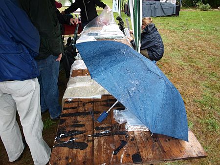 en times biltur fra Vejle i øsende regn ankom vi i nogenlunde tørvejr til Hald og fik lagt vore tryksager frem. Der var som sædvanlig ikke den store tilstrømning til Samrådets bod, men der kom dog enkelte, der mente, at en nyudgivelse var interessant. Se billedet, hvor Nils fortæller. ![]() ![]() og de var kraftige, men teltet var svageligt. Se de sidste billeder. Alle flygtede, men vi holdt længst ud. Alligevel sluttede de udendørs aktiviteter noget før tiden. ![]() Alt i alt dog en spændende dag i parken, som vi varmt kan anbefale, når St bogdag gentages i 2014. Kærlig hilsen Lejf Og fra Nils: Turen til Hald endte desværre noget brat pga. regn, men arrangørerne havde altså også lånt os et telt, der ikke var regntæt. Lejf havde vagten under den kraftige regnbyge, hvilket var en skam, da det ikke var muligt at holde tøjet helt tørt. Der var nogle forbi boden, men generelt måtte selskaberne berette, at bogsalg og indmeldelser var yderst beskedent. Vi glædede os over de første timer og Blicher sange i tørvejr. Alt i alt så jeg knap 10 Verne bøger, hvoraf den mest interessante var den privatindbundne Schou. Men absolut en udflugt værd. Mange hilsener Nils Gave fra Lejf til Nils om bøger :