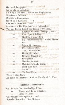 relevant litteratur for kostskolens elever og måske også populær læsning. . ![]() . Næst efter Jules Verne kommer Dumas med 8 titler - og under de engelske oversatte findes 9 titler af Rider Haggard, men han slås med flere hestelængder af Cooper, Dickens, Marryat og Walter Scott. At den tids biblioteker anskaffede Andr. Schous Jules Verne