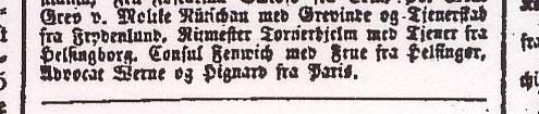 Henrik Wilfred Christensen has conducted archive studies and has found a few traces from the 1861-visit. In the contemporary Danish newspaper “Berlingske politiske og advertissements-Tidende” of Monday the 5th of August 1861 there is a column called “travellers”, which mentions anyone currently staying at the hotels in Copenhagen. At the bottom of the part that deals with “Hotel Phønix” it says: “Attorney-at-law Werne and Hignard from Paris” Since this column does not occur in every newspaper, and since “Berlingske Tidende” was not published on Sundays, it can’t be known for certain when Verne had arrived, nor how long he intended to stay in Copenhagen. Despite this, we see it as a quite reliable source to Jules Vernes’ visit concerning his stay at the “Hotel Phønix” with Hignard, and that the dates, we know, are fairly accurate. Finally, it is interesting that he at this time refers to himself as attorney-at-law. In a debate in the Danish newspaper “Politiken” in 1959 it is questioned whether Verne actually visited Copenhagen in 1861. This should hereby be brought to an end.