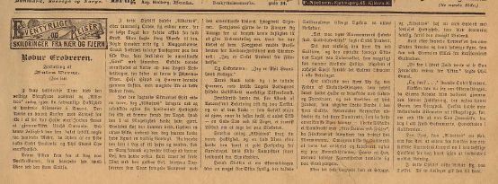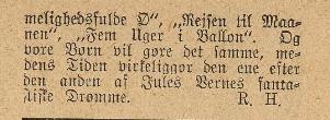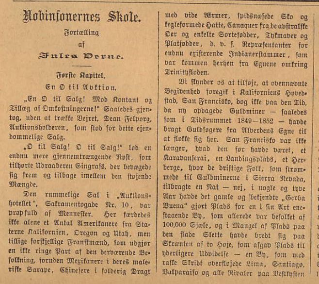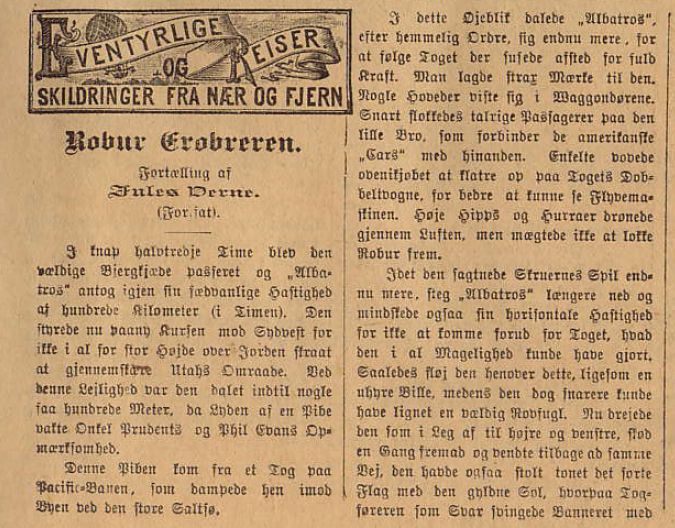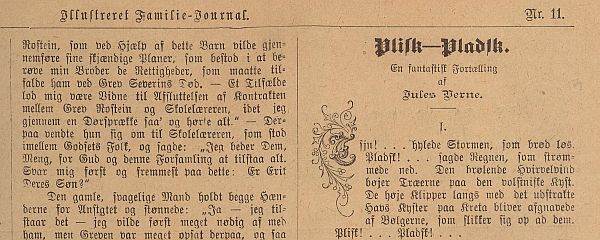 *) Begge i tillægget "Eventyrlige Reiser og Skildringer fra Nær og Fjern". Der er tale om andre oversættelser end dem i Schous "Mindre fortællinger" ![]() ![]() ***) Også kendt som Dr. Hjerteløs. Oversættelsen er forskellig fra den i "No. 9672" fra Andreas Schou. Læs kopi af novellen: pliskplask.html ![]() "Robur Erobreren" 1887 - slutningen bringes som føljeton i nr. 1 - nr. 13 (1. januar - 25. Marts 1888) ![]() ![]() ![]() "Robinsonernes Skole" bringes som føljeton i nr. 24 - nr. 51 (10. Juni - 16. december 1888). ![]() Følgende roman og korte historier har uden tvivl også været bragt i Illustreret Familie-Journal. De er fundet i den svenske udgave, men der er på denne tid meget tæt forbindelse mellem Familie Journalen i Danmark og Sverige.