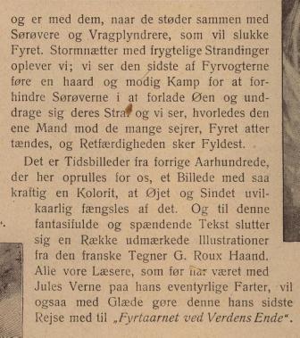 Reklame fra Illustreret Familie-Journals Jule-Nummer fra 1906 for Familiebiblioteket "I ledige Timer" for det kommende år med reklame for "Fyrtårnet ved Verden Ende" med en dramatisk beskrivelse af romanens tilblivelse. I virkeligheden var det Jules Vernes søn Michel Verne , der skrev romanen færdig på grundlag af et udkast til de første 11 kapitler, som Verne havde skrevet i 1901.