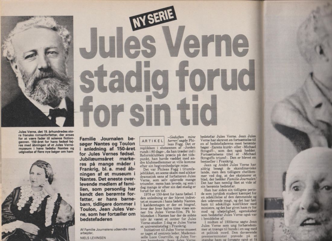 Familie Journalen fra 30. oktober 1978, hvor Niels Levinsen fortæller om Verne i anledning af 150 året. Der er en række kendte billeder, men også et af Jean Jules Verne, hvor han er godt oppe i årene. Han er født i 1892 (mener jeg). Der bliver fortalt om Jean og hans erindringer om bedstefaderen. Det er jo et sladderblad, så derfor: Jeans kone er 30 år yngre end han, og der er en søn på 15 år, Andrée (status 1978).