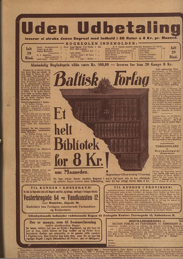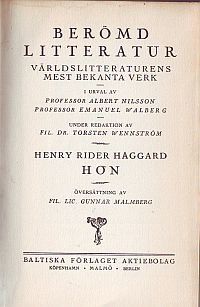 97 timmar och 20 minuter i 1972. En enkelt Haggardroman Hon udgives i 1928 (jf. de svenske bibliografier). ![]() Reklame i ugebladet "Hus og Hjem" fra "Baltisk Forlag", som udsælger bøger til 4 kr 10 øre pr.