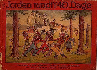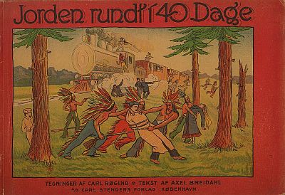 | 1. Jorden rundt i 40 Dage. Trykt og udgivet af A/S Carl Stender. Af Carl Røgind (tegninger) og Axel Breidahl (tekst). 14 sider. 1. udgave 1914. 2. udgave 1918. Tegneserieagtig billedbog. Ved 2. udgaven er farverne noget ændrede og specielt er en del af teksten, der var trykt med sort i 1914-udgaven, nu trykt med rød farve. Det kan være lidt svært at se forskel på forsiderne, men der er farveforskelle. Se stor gengivelse ved klik på forsiderne. |