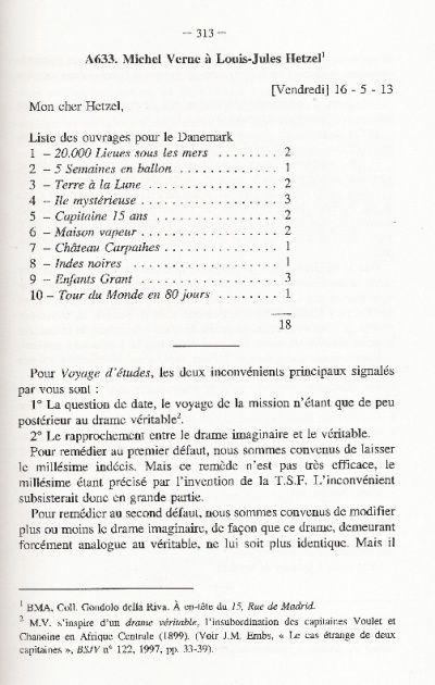 Desværre er det vanskeligt at gengive forsidetegningen i guldtryk korrekt, men i lysere gengivelse ser de således ud:![]() De 10 bind set fra ryggen: ![]() Forsatsen med forlagets monogram og blomsterranker: ![]() Bagsidens madaljon: ![]() "Autoriseret dansk Udgave" ? I hvert bind står Eneste af Jules Verne autoriserede danske Udg., forsynet med de originale franske tegninger. At dette kan skrives 8 år efter Vernes død er jo noget af en påstand. Der findes dog et brev fra 1913, der (muligvis) drejer sig om illustrationerne til Kunstforlagets 10 romaner. Det femte og sidste bind af brevene mellem Verne og forlæggeren udkom i 2006. Louis-Jules Hetzel blandede sig ikke meget i romanernes indhold, så mange af brevene fra perioden 1897 - 1905 er ganske korte og mange handler om regnskabet (den faldende indtjening) og en række bøger, som Verne skal have sendt til venner og bekendte. Da sønnen overtager i 1905 kommer der mere kød på brevene. Omskrivningen og udgivelsen af de sidste bøger kræver lidt mere brevveksling. Her en kopi af brevet fra den 16. maj 1913 fra bogen med den lange titel ”Correspondance Inédite de Jules et Michel Verne avec l’éditeur Louis-Jules Hetzel 1886-1914, tome II 1897-1914” af O.Dumas, V. Dehs og P. Gondolo della Riva på forlaget Slatkine, Geneve 2006. Omtalen af Danmark er lidt af et særsyn, for bøgerne er udgivet i mange lande, og disse udgivelser omtales aldrig i brevvekslingen. En sjov ting at henvendelsen fra Danmark dukker op en passant. Og det er interessant, at de 10 nævnte romaner netop er de 10, der udsendes af Kunstforlaget i 1913.