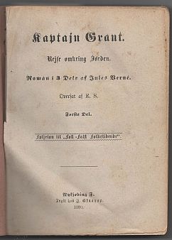 "Kaptajn Grant. Rejse omkring Jorden" . "Roman i 3 Dele af Jules Verne", Oversat af E. S." Føljeton til "Loll-Falst Folketidende". Trykt hos F. Skaarup, Nykjøbing F., 1880. 196 s. Privat halvlæder indbinding. Oversættelsen ervden samme som føljetonen bragt i Frederiksborg Amts