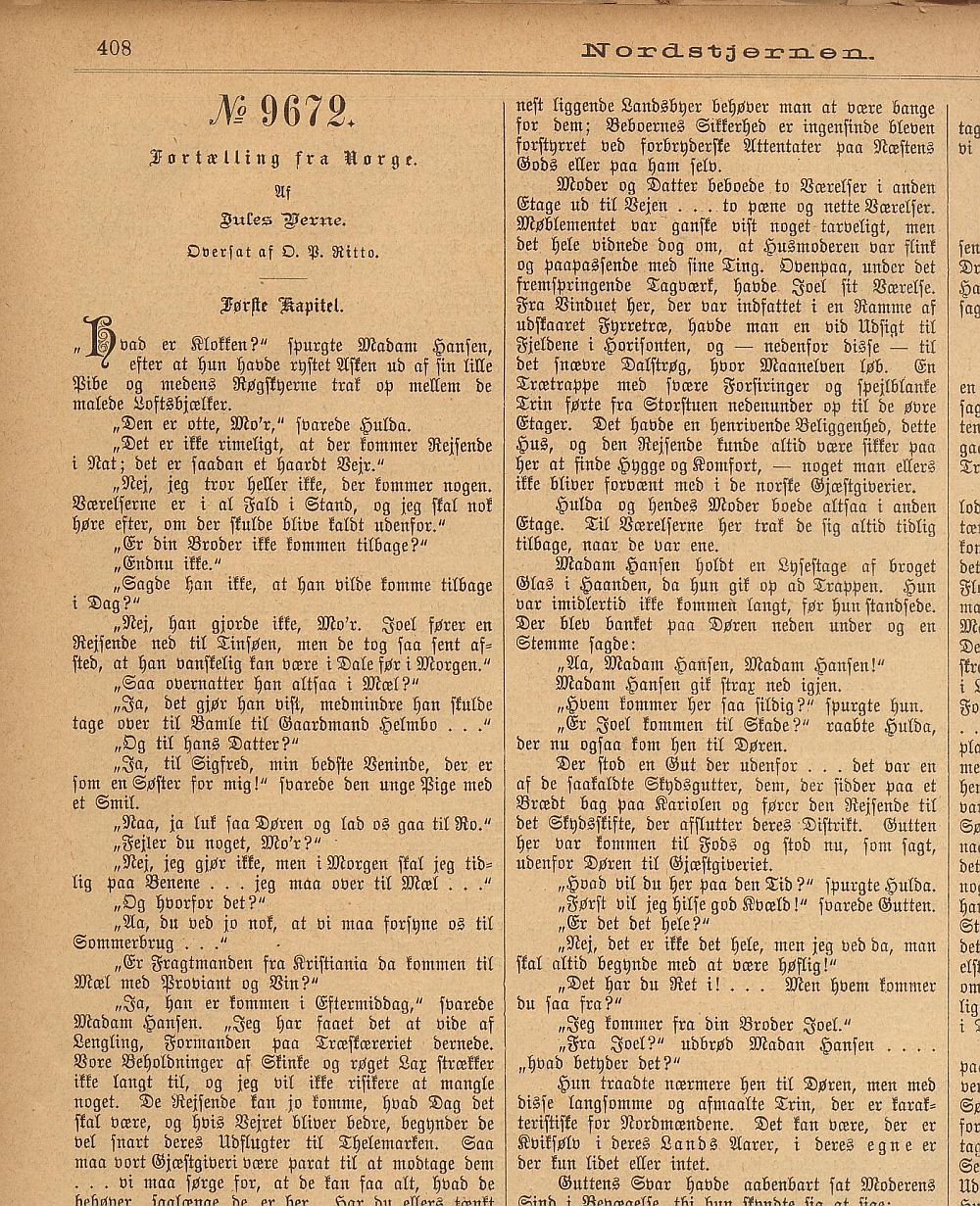 No. 9672. Fortælling fra Norge.Følgeton i Nordstjernen fra 22/5 1887 til 25/9 1887. Oversat af O. P. Ritto. Første udgave af denne roman i Danmark, der i 1888 udsendes på Schous Forlag i en let forkortet udgave, men også i Rittos oversættelse. Kapitel 2 og kapitel 4 hos Schou er forkortede. Kapitel 5 hos