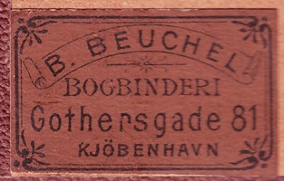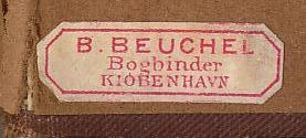 havde behov for det, eller muligvis efter bestilling af en speciel farve. ![]() Om bogbinderne og forsatspapiret: Nogle af de første romaner er med "Beuchel-bind" med brunt forsatspapir samt et lille, fint bogbindermærke Bogbindermærke fra Rejsen til Maanen 1876:
