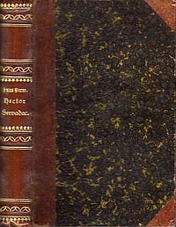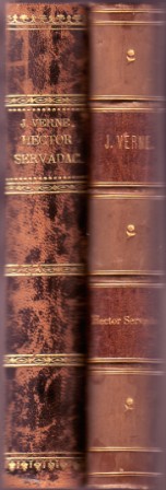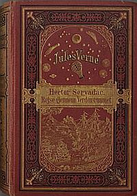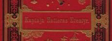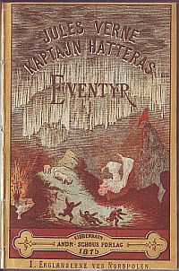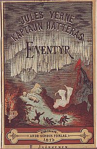 Fra Henriks samling: heftet eksemplar af "5 Uger i Ballon", 2. Oplag 1883 Eksemplaret har fået en noget hård medfart i sit snart 125-årige liv. Forlagsnavnet er med - og man kan se, at "bambusrammen" er tilstede forneden, men den udtyndes til en streg rundt om billedet. Bagsiden er identisk med den, vi kender fra "Mindre Fortællinger". ![]() Fra Allan Jørgensens samling: Privatindbinding af Kaptajn Hatteras i 2 bind, der har bevaret de to forsidetegninger.