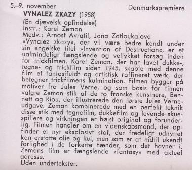 Tysk DVD (Nils sep. 2011) Omtale: A. Program fra Filminstituttets bibliotek fra Filmmuseets fremvisning af Karel Zemans "Vynález zkázy" (1958) med den danske titel: "En djævelsk opfindelse", som delvis bygger på "Face au Drapeau". I programmet står, at det er en premiere, og at filmen blev vist