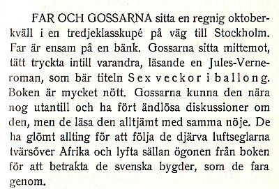 Martn A. Hansen (1909 - 1955), dansk forfatter.![]() Fra "efterladt optegnelse 7.3.40", citeret fra Jan Nissen: "Den unge Martin A. Hansen", Gyldendal 1974, s. 26: I Aarevis betød Jules Verne dog mere (end B. S. Ingemann). Min Farbror havde en fuldtallig samling af hans oversatte Bøger, og jeg har næppe læst nogen af dem mindre end 10 Gange. Efter hvert besøg havde jeg altid et par af dem med hjem og havde desuden under besøget læst to andre ... Det drejer sig givet om de røde bind fra Kunstforlaget 1913. Selma Lagerlöf (1858 - 1940, Nobelpris 1909). Svensk forfatter. ![]() Fra Jean Cl.: Hittade en kul sak i Selma Lagerlöfs novell "Luftballongen" publicerad 1908. Novellen börjar på ett tåg. I en tredjeklasskupé sitter tre personer, en far och hans två söner på väg till Stockholm. Gossarna läser gemensamt i en Jules-Verneroman som har titeln "Sex veckor i ballong". Boken är mycket nött men gossarna kan den nära nog utantill. Även om Selma har utökat ballongfärden med en vecka är hon mycket väl medveten om att den försiggår i Afrika. Annars är novellen ganska typisk för Selma. Grusade förhoppningar, hat, hustrumisshandel, fylleri, alkoholism och slutligen en tragisk olycka i vilken gossarna omkommer. Mvh / Jean C. (Smukt eksemplar af Lagerlöf bog, skænket af Jean Cl.).