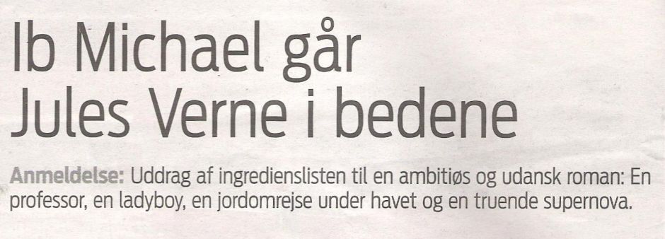 Ib Michael: Jyllandsposten anmelder 18. sep 2015 Ib Michaels bog "En anden sol", der favner naturvidenskaben. Der foretages en jordomrejse under havets overflade, da personerne regner med, at en supernova vil smadre jorden. Anmelderen, Erik Svendsen, kommenterer dette med "Jules verne, go home". ![]() En anden sol. ![]() Dagens Politik indeholder en anmeldelse af Ib Michaels nye bog. Her skriver Bjørn Bredal bl.a. . Her kommer en kærlighedshistorie under havet plus en mordgåde samt især: en fire hundrede sider lang kærlighedserklæring til Jules Verne og "En verdensomsejling under havet". Romanens fire hovedafsnit er prydet med de originale illustrationer fra førsteudgaven, mens romanens sidste side er en række ikoner, som kan skannes, så man når frem til hjerneudvidende sider på nettet ... ![]() I Niels Lyngsøs nye bog Min ukendte bror (Gyldendal 2015) støvsuger den videbegærlige Hans-Peter Skovlunde bibliotek: Hans-Peter