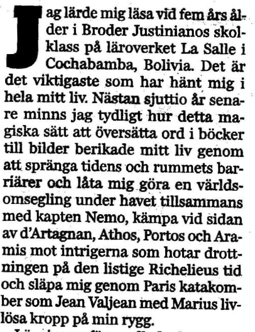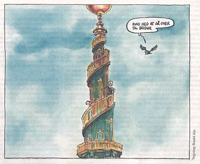Han er uddannet cand.mag. i dansk og filosofi og arbejder som forlagsredaktør samt underviser på Forfatterskolen for Børnelitteratur. Benni Bødker har udgivet en skole-antologi med noget Verne (se Gyldendal). Jan har bl. a. har skrevet "Kaptajn Prometeus", hvori Jules Verne spiller en vis, mindre rolle. ![]() Og endvidere har Benni skrevet "Jagten på den hemmelige bog", hvori Verdensomsejlingen dukker op. ![]() Per Oluf Enquist (f. 1934, svensk forfatter). Per Olof Enquist (modtager af Nordisk Råds litteraturpris mm.) anser i sin selvbiografi "Et andet liv" sin "gendigtning" af "Den hemmelighedsfulde Ø" med titlen "Kaptajn Nemos bibliotek" for sit mest centrale og afgørende værk. ![]() Under skrivningen viste der sig ligesom en hemmelighedsfuld velgører á la Nemo (betyder: ingen) , mens han skrev den på et Minesota-center og reddede ham fra alkoholismen (Hans Ole Krebs Lange, sognepræst). Se om "Kaptajn Nemos bibliotek" under forlaget Høst & Søn. Mette Vinge: Mette Winge omtaler i Politikens kronik den 24. juli 2010 "Min far og jeg" , at osse hun er blevet tvunget til at bestige Frelserkirkens tårn. Roald Als har en nydelig tegning af situationen. Kroniken rummer erindringsglimt om forfatterens far. Hun skriver om, hvordan faderen slæbte hende med op i alle mulige kirketårne: Den værste oplevelse var Vor Frelsers kirketårn. Jeg har aldrig glemt min rædsel, da jeg stod deroppe, hvor trappen snævrer sig ind, og vendte mig om for at gå ned igen og så byen ligge dér langt, langt nede under mig. Jeg klamrede mig til rækværket, som ikke er synderligt højt, og gjorde alt for at beherske min rædsel. Hvordan jeg kon ned, ved jeg ikke. Senere viste det sig, at min far også¨havde det svært med højder, men hans kirketårnsprogram byggede på en antagelse om, at jeg var vild med at klatre op i tårne og stå og se ud over byen ... ![]() Vi kender jo et helt tilsvarende træningsprogram fra Rejsen til jordens indre. Tak for lån af tegningen til Roald Als. I øvrigt kender vi Mette Vinge fra hendes doktorafhandling Dansk børnelitteratur 1900 - 1945 - med særligt henblik på børneromanen, se under Gyldendals Forlag. Gunnar Jørgensen (1896 - 1963, dansk skolemand og forfatter). Skrev 11 bind i en serie om Flemming, hvor første bind udkom i 1918. For nylig udkom den store og meget flotte bog om den danske tegner Axel Mathiesen. Her to forsider til samme bog Flemming og Kvik, seriens bind 3. De to eksemplarer er fra hhv. 1935 og 1961. ![]() Man ser en vældig udvikling i Mathisens tegninger. Når lige denne roman er værd at nævne, er det fordi den opfindsomme Kvik opfører en dukketeaterforestilling fordi han mangler 1,98 kr.: ![]() Og udenfor Norden er der naturligvis masser af forfattere, der henviser til Verne som inspiration. Her indledningen til Mario Vargas nobelföreläning 2010:I