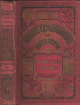 Illustrationer af G. Roux. 491 s. + 1 s. indholdsfortegnelse. Tryk: Imprimerie Gauthier-Villars et Cie, 55, quai des Grands-Augustins, Paris. (Nr. 52747). Dobbeltbind = "Serie B". Indbundet i grøn halvlæder med originale for- og bagomslag medindbundet. (Ryggen har åbenbart ikke været værd at medindbinde) ![]() Iflg. Gondolo della Riva er dette 1. udgaven af denne sidste af Jules Vernes romaner, udgivet samtidig med det lille format. |