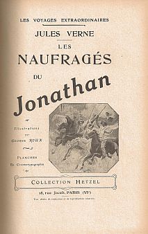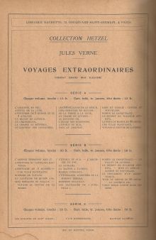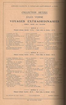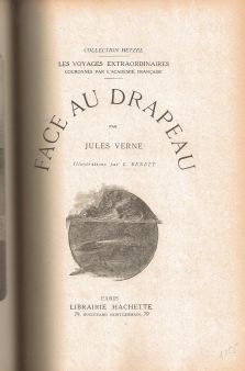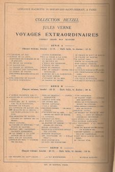 interessant eksemplar. VE14 "Le Chancellor" med "Martin Paz". Librairie Hachette, 79, Boulevard Saint-Germain, 79, Paris. (ca. 1928). Illustreret af Riou og Férat. 220 s. Tryk: Imp. de Vaugirard, Paris. 1928. Omslagstryk: Imp. de Matteis, Paris. Heftet enkeltbind(=Serie A) indbundet i grøn halvlæder - sammen med VE44. ... ![]() ... VE44 "Face au Drapeau" Librairie Hachette, 79, Boulevard Saint-Germain, 79, Paris. (ca. 1928). Illustreret af L. Benett. 220 s. + 1 s. indholdsfortegnelse. Tryk: Imprimerie de Vaugirard, H.-L. Mott, Directeur, Impasse Ronsin, Paris. Omslagstryk: Imp. de Matteis, Paris. Heftet enkeltbind(=Serie A) indbundet i grøn halvlæder sammen med VE14. ... ![]() Som det fremgår af bagsidereklamen kostede Serie A 10 Fr. pr. bind, men på ryggene af begge eksemplarer er der overtrykt med ny pris: 15 Fr. Dette kan meget vel passe med dateringen 1928-29, hvor inflationen tog fart efter børskrakket i New York, som spredte sig til hele verden. Det er interessant at se hvordan de heftede eksemplarer fra både Hetzel og Hachette ser ud. VE 28 "Robur-le-Conquérant" og VE 29 "Un Billet de Loterie - Le Numéro 9672" med "Fritt-Flacc". Librairie Hachette, 79, Boulevard Saint-Germain, 79, Paris. 1922. 218 s. + 1 s. indholdsfortegnelse og 188 s. Illustrationer af L. Benett og af G. Roux. Tryk: Imp. Vaugirard, H.-L. Mott, Directeur, 12-13, Impasse Ronsin, Paris. Omslagstryk: Imp. de Matteis, Paris.Dobbeltbind = Serie B. Bind: Grøn halvlæderindbinding med originale for- og bagomslag medindbundet. ![]() ![]() VE65 "L´Étonnante Aventure de la Mission Barsac" del 1-2. Librairie