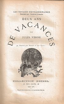 permer. Designet af A. Lenegre. VE 28 + VE 29: Jules Verne: Robur le Conquérant - Un billet de loterie, Hetzel et Cie, Paris 1886, 221 sider + 199 sider, Illustreret af Benett og Roux, katalog DF medindbundet. Guldsnit på tre sider. VE 32: Jules Verne: Deux ans de Vacances, Hetzel og Cie, Paris udateret, men med katalog EL, der er fra 1888, 474 sider, illustreret af Benett og et farvelagt kort. Guldsnit på tre sider. . ![]() . Begge bøger har bogbinderens navn, A. Lenègre, nederst på forpermens højre hjørne. . ![]() VE 51: ”Bourses de Voyage”. .