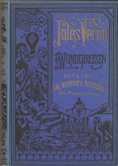 "Het Geheimzinnige Eiland De Luchtschipbreukelingen", Serien "Wonderreizen", 7. oplag Elsevier 1931. Med originale franske illustrationer. 223 s. + 3 s. indh. Book- en Kunstdrukkerij P. A. Geurts, Nijmegen. Gråblå komponeret helshirting med tryk i sort og guld - med originalt smudsomslag.