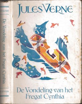 VE 55: Cynthias vrag (XXXIV). "De Vondeling van het Fregat Cynthia", Serien "Wonderreizen", 3. oplag Elsevier u. år (ca. 1928). Med originale franske illustrationer.235 s. + 1 s. indh. Book- en Kunstdrukkerij P. A. Geurts, Nijmegen. Gråblå komponeret helshirting med tryk i sort og guld - med originalt smudsomslag. . De vondeling van het fregat Cynthia, Amsterdam/brussel 1978. Uforkortet med de originale billeder.