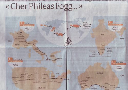 Fra "Le Monde", 28. sep. 2009: En franskmand Guillaume Prébois har cyklet jorden rundt på 80 dage. Kortet fra avisen viser, at han har taget en lidt alternativ rute over Australien, men så kommer Kaptajn Grants Børn jo næsten også med. ![]() ![]() Denne unge japanske cyklist traf Lejf på en rasteplads i New Zealand. Han har lang vej endnu, har afsat 2 år og ikke kun 80 dage til projektet. Han håber på et tidspunkt også at nå til Danmark. ![]() Jorden rundt alene: ![]() Beretningen om Joshua Slogum,