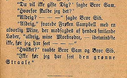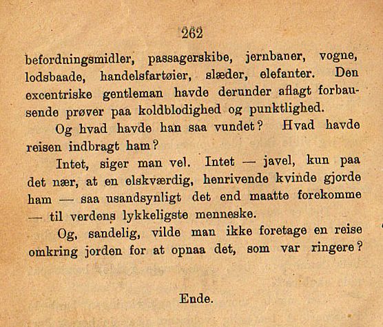 "Avisens føljeton: Jorden rundt i 80 dage , Kristiania, Nikolai Olsens bogtrykkeri, Grændsen 2 Bak: Annonser for Olaf Norlis forlag Universitetsgd. 24, Kristiania, så - muligens fra Olaf Norlis forlag Eksemplaret er for hånd påskrevet året 1897 , så dette er kanskje utgivelsesåret? (Nils og Per Johan) ![]() Det