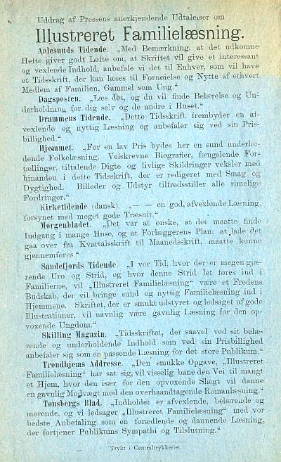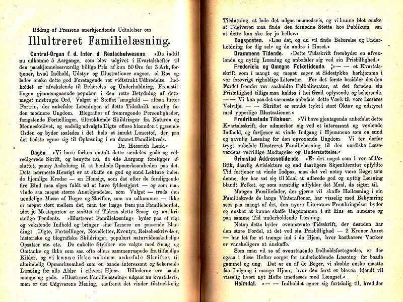 Bind VI 1887: ILLUSTRERET FAMILELÆSNING. Udgiven under medvirken af Foreningen til Udbredelse af god og nyttig Læsning blandt Folket. Redigeret af G. Kr. Johs. Parmann. Bind VI. Oslo 1887. 8vo. 181 + (3) p. Med tittelbilledeog 30 illustrationer. Av innholdet: 'Oppdagelsesreiser i Afrika' av Jules Verne.. -Noen anmeldelser innbundet bak, tok jeg også med,