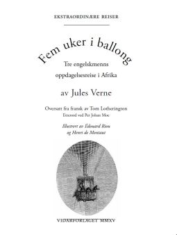 1. Mathias Sandorff. 2008 Vidarforlaget AS. Utgitt: 9. juni 2008. Oversettelse ved: Bente Christensen Innbinding: trådinbundet, Sidetall: 496. Språk: Bokmål. ISBN: 9788279900269. Pris: kr. 398,- ![]() 704 sider, 449 kr., oversat af Bente Christensen, ISBN: 9788279900368. Illustrert med 172 vignetter av Riou. Etterord af Per Johan Moe. . ![]() 3. Kaptajn Hatteras, 2014 552 sider, 399 kr., ocersat av Tom Lotherington, ISBB: 9788279902089. . ![]() 4. Fem uker i ballong, 2015. . 404 sider. Pris 349 kr., oversat af Tom Lotherington, etterord av Per Johan Moe. ISBN: 9788279902935 . ![]() I etterordet kommenteres bl.a. Jules Vernes noe skeptiske syn på ballonger og tiden omkring starten på forfatterskapet, like etter Skandinaviareisen i 1861. Det faktum at hans store inspirator, E.A.Poe også har skrevet om (The balloon hoax) en ballong med samme navn som Vernes Afrika-ballong "Victoria", belyses også. I tillegg er Jules Vernes beskrivelse av sin egen ballongferd i 1873 med i Vidarforlagets utgivelse. Bogen har et flot smudsomslag i den gamle stil fra Hetzel-forlagets tid. 5. En verdensomseiling under havet. 2015. . 532 sider, 399 kr., oversat af Bente Christensen, ISBN: 9788279903420 30 sider langt, fortræffeligt etterord af Per Johan Moe. Illustreret med de originale tegninger. ..