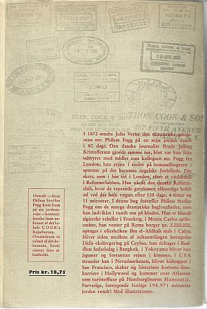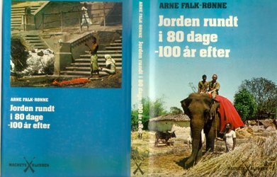 ![]() ![]() Frode Jelling Kristoffersen: Jorden rundt på tommelfinger, forlaget Sirius, 1960, 215 sider. Der er et kort i bogen, der viser at den originale rejserute er fulgt rimeligt godt, og der er fotos fra turen. Bogen er humoristisk, som man vil forvente det af Frode Kistoffersen. Arne Falk Rønne: Jorden rundt i 80 dage - 100 år efter", af Arne Falk Rønne, Fremad 1977, 188 sider. Falk-Rønne tager udgangspunkt i "Jorden rundt i 80 dage" og den rejsende er "Maxpartout"!! Ruten ligner den oprindelige, men transportmidlerne noget mere moderne. Så på en måde er det en dansk forgænger til Michael Palin. Iøvrigt er Falk-Rønne en ypperlig rejseskribent, så bogen er også værd at læse. Bogen udsendes i to udgaver: en forlagsudgave og en bogklubudgave fra "Machete klub". Det angives, at Jorden Rundt..er bind 3 blandt 6 Falk-Rønne bøger, der udgives som de første i klubben. Årstallet er 1977 for begge udgaver. Bogklubudgaven: