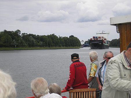 Det var en rigtig fin tur på Kielerkanalen, specielt fordi der var et kæmpe kagebord med i prisen. Vi skulle passere en enkelt sluse, lige inden udmundingen ved Kiel. Rederiet Adler-Schiffe sejler en række ruter i sommerhalvåret - de fleste