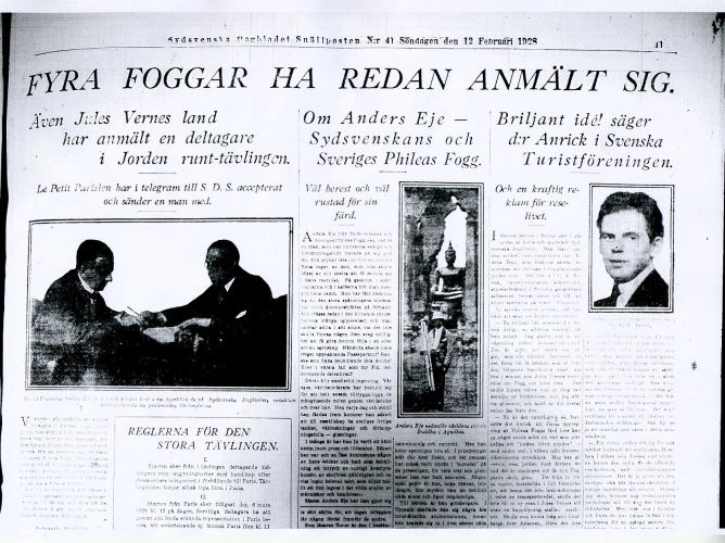 Jorden runt tävling 1928 ordnades det som bekant (?) en jorden runt-tävling i Phileas Foggs anda. Svensk deltagare var Anders Eje, dansk Jörgen (?). Bifogar klipp från Sydsvenska Dagbladet den 12 februari. Ett resereportage från Anders Eje fanns i Sydsvenskan den 22 april, flera finns säkert.