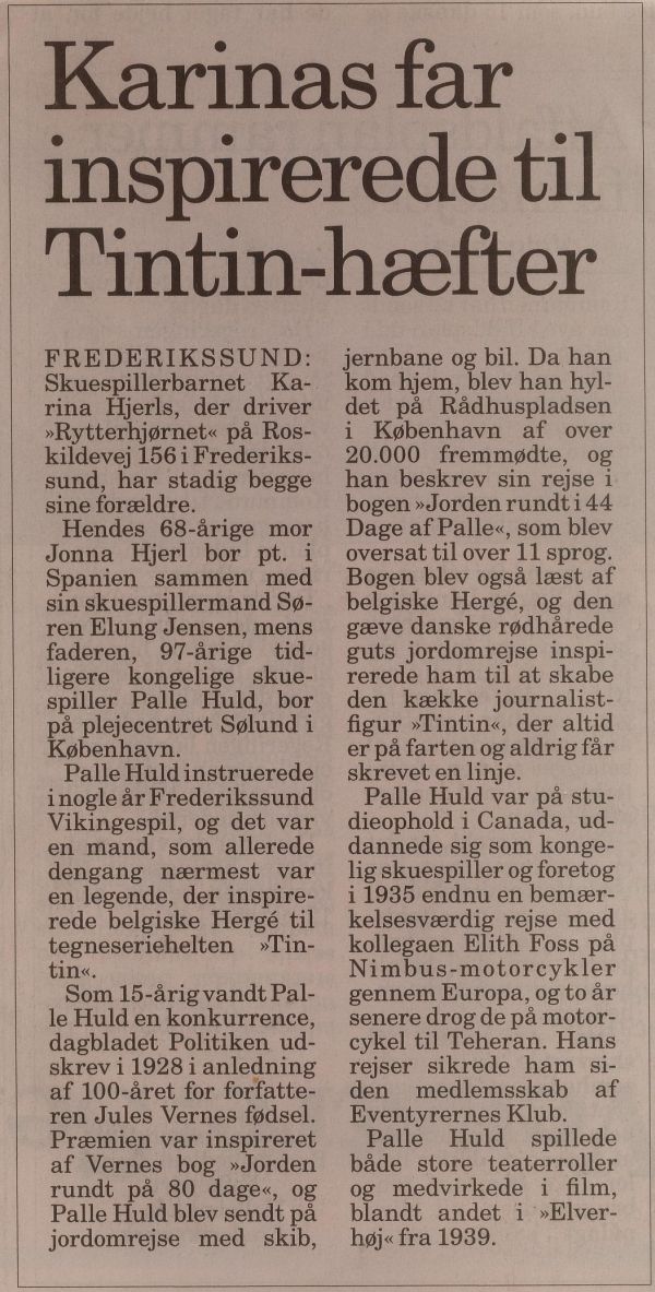 Jorden rundt med Palle Huld: Palle Huld var født i 1912 og døde i 2010, 98 år gammel. Han var i lære som modehandler,da han i 1928 som reservedelslagerassistent vandt en konkurrence i dagbladet Politiken og foretog en rejse "Jorden rundt i 44 dage" med skib, jernbane og bil. Konkurrencen var udskrevet i anledning af Jules Vernes 100-års fødselsdag. Ved hjemkomsten blev han af 20.000 fremmødte hyldet og fejret på Københavns Rådhusplads. Allerede i gymnasiet spillede han komedie med Sigrid Horne Rasmussen og Hans Kurt. Efter et studieophold i Canada fra 1928-1931 blev han 1932-34 uddannet på Det Kongelige Teaters Elevskole. Han debuterede 4. maj 1934 i "Helligtrekongersaften" og blev fastansat på teatret i 1936. Fra Ekstrabladet 2009: Da Tintin i weekenden fyldte 80 år, kunne han sende varme tanker til den danske skuespiller Palle Huld. Det var nemlig ham, der for mere end 80 år siden inspirerede den belgiske tegner Hergé til at skabe den kække journalist, der stort set aldrig får skrevet en linje, men som altid er på farten, skriver Ekstra-Bladet. "Ja, det er rigtigt. Han havde vist hørt om min jordomrejse og set nogle artikler om den. Så den er god nok, at det er mig, der danner baggrund for den," siger Palle Huld, der er i dag er 96 år, til Ekstra Bladet.