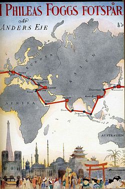Anders Ejes bok ”I Phileas Foggs fotspår”. Bonniers förlag, tryckt år 1928. Både det medbundna omslaget och det vackra klotbandet föreställer den första delen av resan, genom Europa och Asien. 70 dagar tog det för Anders Eje och Jörgen Bast från Danmark att var för sig tävla sig runt Jorden! Bakre omslaget på den häftade versionen av boken visar faktiskt resten av resan, så hela resan finns i en bok! Jörgen, dansken, vann med 11 minuter…