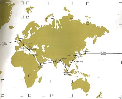 verdenskort med rejsen indtegnet og plads til 14 samlebilleder. Det eksemplar, jeg har