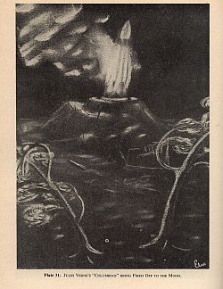 Den forklarende tekst hos Bording: Projektil-waggonen, i hvilken Jules Verne i 1865 i sin fremtidsroman, »Rejsen til Månen«, lod to uforfærdede amerikanere og en lige så modig franskmand samt hundene Diana og Drabant udskyde fra en 900 fod lang kæmpekanon, specielt konstrueret til at give projektilet kraft nok til at føre de ombordværende til Månen på de beregnede 97 timer, 13 minutter og 20 sekunder. Projektilet var indrettet med al den luksus, der sømmede sig for gesandter fra Jordkloden, med læderpolstrede vægge, runde divaner og smukt hvælvet bambusloft, og i provianten var der rigeligt med Champagne, da afskydningen fandt sted i Stoneshill i Florida den 1. december 1865. Fra et vindue nød de tre mænd den vidunderlige rejse i himmelrummet og nåede Månen den 5. december, l knap 20 kilometers afstand fra overfladen kunne de tydeligt studere denne planets ejendommelige landskab, men på grund af den enorme hastighed formåede de ikke at bringe projektilet til landing på Månen. Det foretog et enkelt kredsløb om Månen og satte derefter atter kursen mod Jorden, hvor det landede i Stillehavet den 11. december og blev taget ombord i den amerikanske marinekorvet »Susquehanna«, som bragte de månerejsende til San Francisco. Umiddelbart efter den vellykkede færd stiftede begejstrede og initiativrige amerikanere et aktieselskab under navnet »Nationalselskabet for Kommunikationerne imellem Stjernerne«. Formålet var at udnytte erfaringerne fra dette enestående forsøg, således at en fast forbindelse med Månen kunne etableres. For at de flest mulige kunne blive delagtiggjort i universets mysterier, skulle fremtidige rejser foregå i projektiltog. I samme område har vi følgende bog af den kendte amatørastronom C. Luplau Jansen udsendt på Fremads Forlag i 1958. Bogen har den efterfølgende omtale af Rejsen til månen, og interessant er det også, at Kurt Laschwitz nævnes, jvf. omtalen af I ledige Timer.