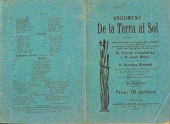 Fra Nils dec 2008: Et sjovt lille hæfte, der ikke har noget med Rejsen til Månen at gøre, men som stammer fra et teaterstykke, der er opført i Barcelona fra 1879 og frem. Stykket hedder ”De la terra al Sol” i tre akter og 11 tableauer. På de 16 små sider er en del blevet udeladt. Sproget er katalansk. Der findes katalansk-engelske ordbøger på nettet, men flere af ordene er i gammel form, så det kan knibe lidt med en fuld oversættelse. Ordet Viatje staves i dag Viatge = Rejse.