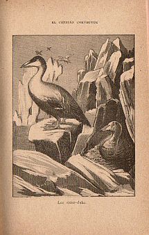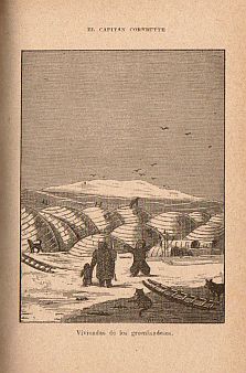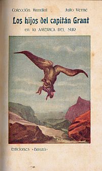 ![]() ![]() ![]() - som jo skildrer en reise opp langs nord-Norge og over havet til Grønland. På forsidebladet vises isbjørnen i kamp med (så vidt jeg husker) Andrè Vasling og de norske 'villmennene' Jocki og Herming. De øvrige illustrasjonene fra boken, har jeg heller ikke sett før (selvom andre illustratører har avbildet samme motiv): Ærfugl fra Norge, Igloer og fangstskute fra Grønland. ![]() Denne spanske utgaven, et bind i serien; "Obras de Julio Verne" kom i dobbelt-bind sammen alle tre volum av Kaptein Grants barn. Det kan se ut som at boken er en innbinding av spanske hefter. Farge-forsider til dem alle er med. Jeg legger ved skan av forsiden av hefte 1 - som har en forsideillustrasjon som leder tankene hen til forsiden på Norsk barneblads forlags utgivelse av samme tittel , tegnet av Jens R. Nielsen (N): http://jules-verne.dk/nonorskbarneblad.html . En