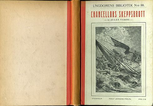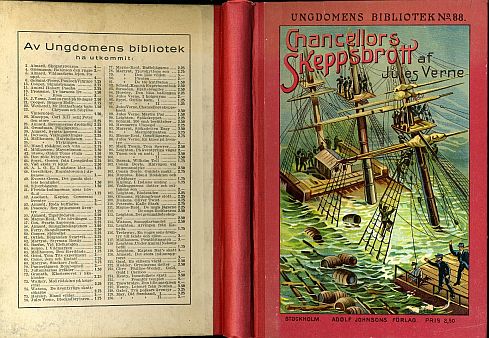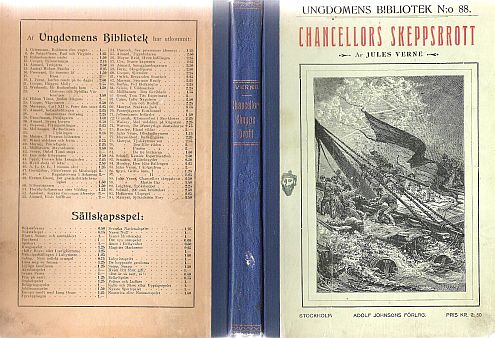 5: Chancellors skeppbrott. 1905: "Chancellors skeppsbrott". 253 s. 10 illustrationer av E. Riou och Paul Férat. Översättning av N. Nisbeth. Ingår i serien Ungdomens bibliotek, No. 88. Tryckår: 1905